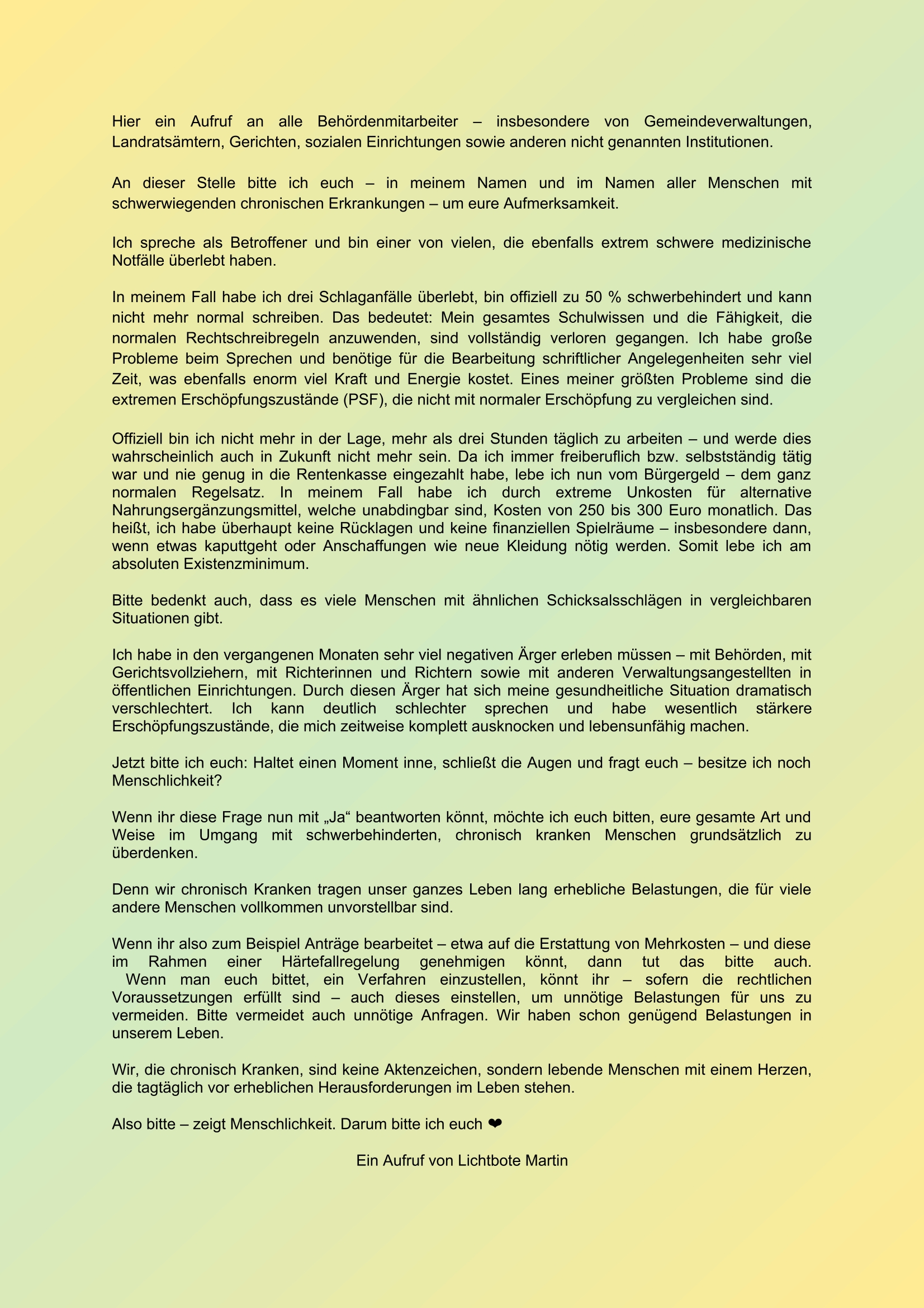 Dieser Aufruf wurde in die Formate PDF, JPG und PNG umgewandelt, um ihn überall leicht teilen zu können. Diese Dateien können hier heruntergeladen werden. Mit der Bitte, diese in sozialen Netzwerken zu verbreiten. Bitte bedenkt, dass es hierbei nicht nur um mich geht, sondern auch um viele andere Menschen in vergleichbaren Situationen.
